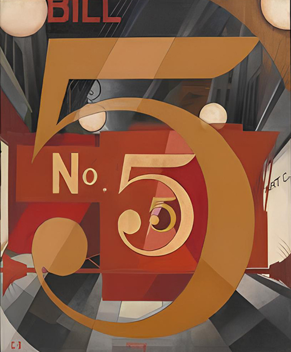 Poiché con la pittura non si può rendere il suono, nel dipinto il suono è sostituito dal movimento a cannocchiale – a significare che il camion si avvicina e poi si allontana – del 5, ripetuto fino a quattro volte.20 Come scrive Dijkstra, il 5 «strains and pulls, receding and projecting itself again onto the canvas, its original movement in time transformed into visual tensions» (Dijkstra 1969, 78). Da notare come, nel dipinto, la forma panciuta di questo numero sia richiamata, accompagnata, qua e là, dalle forme circolari delle luci così da metterla ancora più in rilievo. Da notare, inoltre, che il numero cinque più interno è costituito da una lamina d’oro: è il più piccolo, ma è il più luccicante (Breslin 1977, 261). In questo modo, il pittore intende suggerire che il numero può essere visto sia quando il camion è ancora lontano, sia quando è già lontano. È ovvio che, concepito come l’unico elemento portante del quadro (gli altri, appena visibili, sono marginali), il numero diventa la sineddoche del camion (come, del resto, denuncia il titolo). Sullo sfondo, appena percettibili, i grattacieli della città si intravvedono nella notte e le molteplici linee oblique che attraversano il quadro sono riferibili alla pioggia che cade. Il numero e la sua forma annullano, dunque, quasi tutto il resto. Come scrive Halter, il numero «becomes one of the new heraldic signs that are part of the specific beauty of the modern age» (Halter 1991, 98). Non simbolo gentilizio, ma solo quantitativo, il numero qui diventa l’emblema della società industriale e commerciale di quel mondo. Il titolo che Demuth dà al quadro indica chiaramente la ragione per cui egli elesse Williams a suo soggetto: giudicò questa poesia un capolavoro tramite il quale immortalare l’autore.
